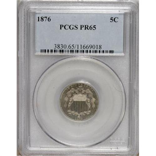 <B>1876 5C PR65 PCGS.</B></I> PCGS Population (75/31). NGC Census: (81/35). Mintage: 1,150. Numismedia Wsl. Price for NGC/PCGS coin in PR65: $725. (#3830)<BR><BR><b>Shipping:</b> Coins & Currency (<a target="_blank" href="http://www.heritageauctions.com/common/shipping.php">view shipping information</a>)