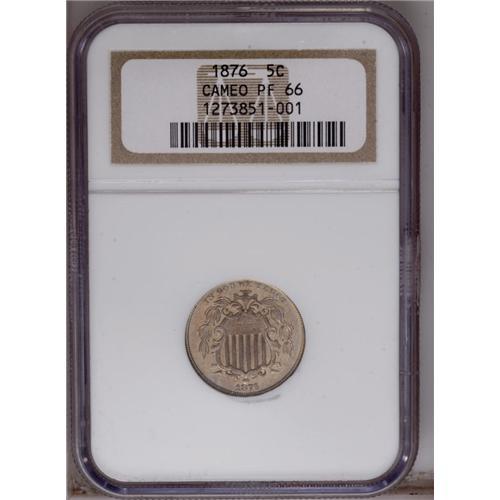 <B>1876<5C> PR66 Cameo NGC.</B></I> Fully struck with attractive milky patina and lovely cameo contrast on each side. The expertly preserved surfaces seem nearly pristine. Census: 18 in 66 Cameo, 3 finer in Cameo condition (1/06).