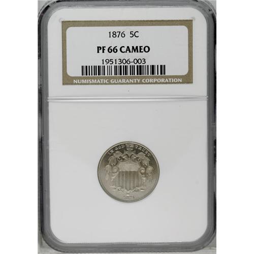 <B>1876<5C> PR66 Cameo NGC.</B></I> The suitably frosted devices are fully defined atop nicely reflective fields. A hint of mauve toning is seen over each side. Scarce with this combination of quality and contrast.