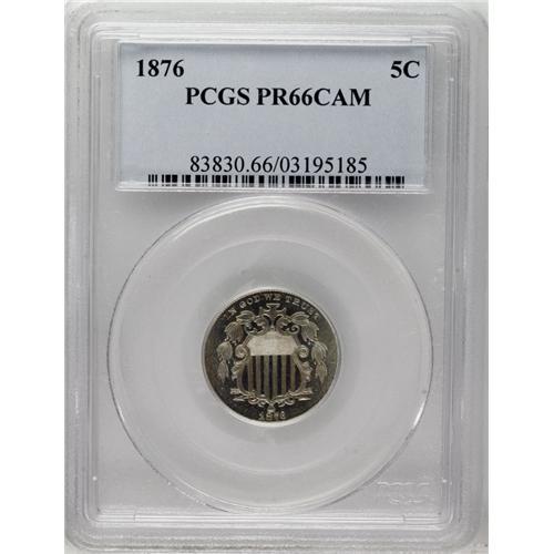 <B>1876 5C PR66 Cameo PCGS.</B></I> A sharply struck and highly attractive cameo proof with light nickel-gray surfaces and excellent contrast. Population: 19 in 66 Cameo, 3 finer (12/06).<BR><BR><b>Shipping:</b> Coin/Currency (<a target="_blank" href="http://www.heritageauctions.com/common/shipping.php">view shipping information</a>)