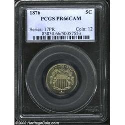 <TABLE cellSpacing=0 cellPadding=0 width="100%" bgColor=#000000 border=0><TBODY><TR><TD width="100%"><TABLE cellSpacing=1 cellPadding=3 width="100%" border=0><TBODY><TR><TD width="100%" bgColor=#79735c><FONT face=arial color=#ffffff size=3><B>Description</B> </FONT></TD></TR><TR><TD width="100%" bgColor=#ffffff><FONT face=arial size=2><B>1876 5C PR66 Cameo PCGS.</B></I> Lovely yellow and steel-blue iridescence resides on the obverse while lovely, even, olive color decorates the reverse. There is a small planchet flaw (as struck) near the upper left reverse rim, between the D and the first S of UNITED STATES. Population: 8 in 66, 0 finer (8/03). </FONT></TD></TR></TBODY></TABLE></TD></TR></TBODY></TABLE><BR><A name=PricesRealized></A><TABLE cellSpacing=0 cellPadding=0 width="100%" bgColor=#000000 border=0><TBODY><TR><TD width="100%"><TABLE cellSpacing=1 cellPadding=3 width="100%" border=0><TBODY><TR><TD width="100%" bgColor=#79735c><A name=PR><FONT face=arial color=#ffffff size=3><B>Previous Prices from Heritage Auctions</B> </FONT></A></TD></TR><TR><TD bgColor=#f6f6ed><TABLE cellSpacing=0 cellPadding=0 width="100%" border=1><TBODY><TR><TD align=middle width="33%"><B>Date</B></TD><TD align=middle width="33%"><B>Service</B></TD><TD align=middle width="33%"><B>Price</B></TD></TR><TR bgColor=whitesmoke><TD width="33%"><B>07/29/2003</B></TD><TD width="33%">PCGS</TD><TD width="33%">$1,610.00</TD></TR><TR bgColor=whitesmoke><TD width="33%"><B>04/15/2003</B></TD><TD width="33%">PCGS</TD><TD width="33%">$2,070.00</TD></TR><TR bgColor=whitesmoke><TD width="33%"><B>04/15/2003</B></TD><TD width="33%">PCGS</TD><TD width="33%">$2,070.00</TD></TR><TR bgColor=whitesmoke><TD width="33%"><B>11/23/2002</B></TD><TD width="33%">PCGS</TD><TD width="33%">$2,070.00</TD></TR><TR bgColor=whitesmoke><TD width="33%"><B>09/17/2002</B></TD><TD width="33%">PCGS</TD><TD width="33%">$2,357.50</TD></TR><TR bgColor=whitesmoke><TD width="33%"><B>09/17/2002</B></TD><TD width="33%">PCGS</TD><TD width="33%">$2,357.50</TD></TR><TR bgColor=whitesmoke><TD width="33%"><B>07/30/2002</B></TD><TD width="33%">PCGS</TD><TD width="33%">$1,840.00</TD></TR><TR bgColor=whitesmoke><TD width="33%"><B>05/07/2002</B></TD><TD width="33%">PCGS</TD><TD width="33%">$1,782.50</TD></TR><TR bgColor=whitesmoke><TD width="33%"><B>05/07/2002</B></TD><TD width="33%">PCGS</TD><TD width="33%">$1,782.50</TD></TR><TR bgColor=whitesmoke><TD width="33%"><B>03/23/2003</B></TD><TD width="33%">NGC</TD><TD width="33%">$1,955.00</TD></TR><TR bgColor=whitesmoke><TD width="33%"><B>07/30/2002</B></TD><TD width="33%">NGC</TD><TD width="33%">$1,035.00</TD></TR><TR bgColor=whitesmoke><TD width="33%"><B>07/30/2002</B></TD><TD width="33%">NGC</TD><TD width="33%">$1,035.00</TD></TR></TBODY></TABLE></TD></TR><TR><TD bgColor=#ffffff><FONT face=arial size=1 ?>PLEASE NOTE: All prices realized reflect the final hammer price PLUS the buyer's premium in auctions that charge a buyer's premium. Each item has a notation at the top of the listing indicating whether that lot included a buyer's premium. Example: A item that sells with a final hammer price of $100 and a 20% buyer's premium will display with a price realized of $120. All information listed is intended to be as accurate as possible, but errors are possible. Please use this guide carefully and inform us of any inaccuracies. </FONT></TD></TR></TBODY></TABLE></TD></TR></TBODY></TABLE><BR><TABLE cellSpacing=0 cellPadding=0 width="100%" bgColor=#000000 border=0><TBODY><TR><TD width="100%"><TABLE cellSpacing=1 cellPadding=3 width="100%" border=0><TBODY><TR><TD width="100%" bgColor=#79735c colSpan=6><FONT face=arial color=#ffffff size=3><B>Price Guide*</B> </FONT></TD></TR><TR bgColor=#f6f6ed><TD align=middle><B>Grade</B> </TD><TD align=middle><B>Coin World<BR>(Trends)</B> </TD><TD align=middle><B>Numismedia<BR>Retail</B> </TD><TD align=middle><B>Numismedia<BR>Wholesale</B> </TD><TD align=middle><B>Coin<BR>Universe</B> </TD><TD align=middle><B>Heritage<BR>Value Index</B> </TD></TR><TR bgColor=#ffffff><TD align=middle>65</TD><TD align=right>---</TD><TD align=right>---</TD><TD align=right>---</TD><TD align=right>---</TD><TD align=right>$638.00</TD></TR><TR style="FONT-WEIGHT: bold" bgColor=#cccfdd><TD align=middle>66</TD><TD align=right>---</TD><TD align=right>---</TD><TD align=right>---</TD><TD align=right>---</TD><TD align=right>---</TD></TR><TR bgColor=#ffffff><TD align=middle>67</TD><TD align=right>---</TD><TD align=right>---</TD><TD align=right>---</TD><TD align=right>---</TD><TD align=right>---</TD></TR><TR bgColor=#ffffff><TD colSpan=6><FONT size=1>*All information listed is intended to be as accurate as possible, but errors are possible. No item may be returned or refused based on this information which is provided as a service to our customers. You should contact each pricing source directly to determine the accuracy of this information. </FONT></TD></TR></TBODY></TABLE></TD></TR></TBODY></TABLE><BR><TABLE cellSpacing=0 cellPadding=0 width="100%" bgColor=#000000 border=0><TBODY><TR><TD width="100%"><TABLE cellSpacing=1 cellPadding=3 width="100%" border=0><TBODY><TR><TD width="100%" bgColor=#79735c><FONT face=arial color=#ffffff size=3><B>Population Guide</B> </FONT></TD></TR><TR bgColor=#ffffff><TD align=middle><!-- Begin Output of Population Grid--><TABLE cellSpacing=0 cellPadding=0 width="100%" border=0><TBODY><TR><TD vAlign=center><TABLE cellSpacing=0 width="100%" border=1 cellsadding="3"><TBODY><TR><TD vAlign=center><TABLE cellSpacing=0 cellPadding=3 width="100%" border=1><TBODY><TR><TD vAlign=center align=middle bgColor=#f0f1e8 colSpan=2 <CENTER><FONT face=Arial size=2><B>PCGS Pop </B></FONT><CENTER></CENTER></TD><TD vAlign=center align=middle bgColor=#f0f1e8 colSpan=2><CENTER><FONT face=Arial size=2><B>NGC Pop</B></CENTER></FONT></TD></TR><TR><TD vAlign=center><FONT face=Arial size=2>(66)</FONT> </TD><TD vAlign=center align=right><FONT face=Arial size=2>8</FONT> </TD><TD vAlign=center><FONT face=Arial size=2>(66)</F