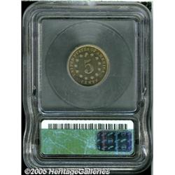 <B>1876 5C PR66 ICG.</B></I> Iridescent bands of sky-blue, plum, lime, and peach color provide unusual eye appeal. A crisply struck and unabraded Centennial year Gem.