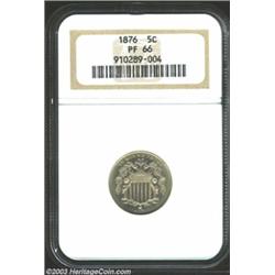 1876 5C PR66 NGC. Razor sharp striking definition is noted throughout both sides of this golden tinged Gem. Smooth with eye appeal that would do wonders for a high grade proof type set. Important notice: We expect to be auctioning lots at the rate of 200-250 per hour. On occasion eBay live bid software cannot keep up with the pace of the auctions where 4-5 lots per minute can hammer down, so we recommend that you place a realistic absentee bid now as insurance to avoid disappointment. Also please note that all Heritage/CAA lots purchased through eBay Live carry a 20% Buyer's Premium. Please make sure you read the Terms and Conditions.