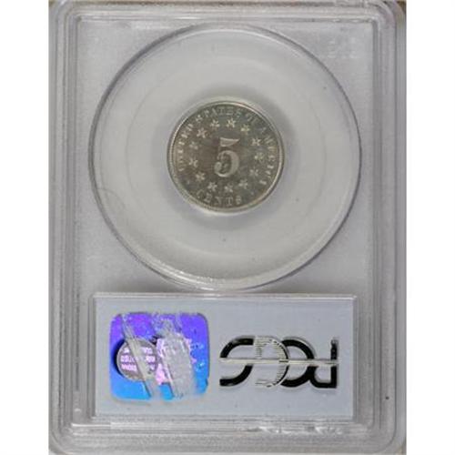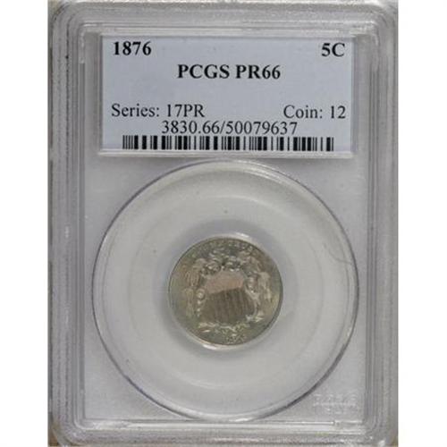 <B>1876 5C PR66 PCGS.</B></I> A crisply struck centennial coin with lovely blue and gold toning over each side. A small dark spot is noted in the center of the shield. PCGS has certified just one finer non-Cameo specimen (6/07).<BR><BR><b>Shipping:</b> Coins & Currency (<a target="_blank" href="http://www.heritageauctions.com/common/shipping.php">view shipping information</a>)