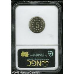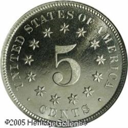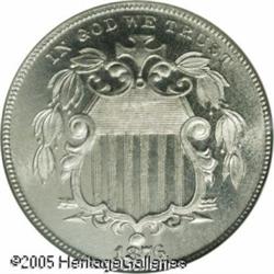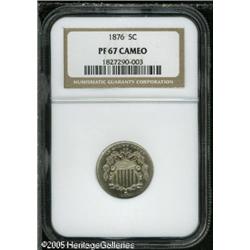 <B>1876 5C PR67 Cameo NGC.</B></I> Struck in this popular Centennial year, Superb examples of the Shield nickel are eagerly by collectors. This is a brilliant proof that is nicely mirrored in the fields with significant mint frost over the devices which yields a noticeable amount of contrast on each side. Flashy and highly attractive. Population: 2 in 67, 1 finer (1/05). Lot:5851