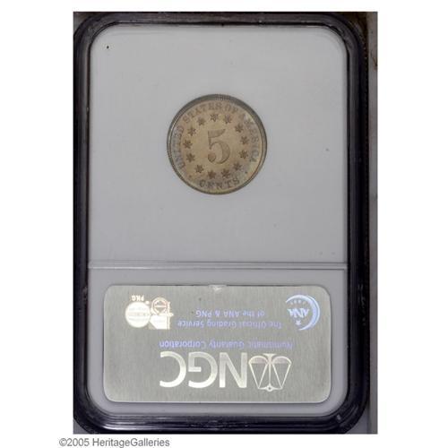 <B>1876<5C> PR67 NGC.</B></I> Fully struck and pristine, this marvelously preserved Superb Gem exhibits lovely toning variations over each side, in pastel shades of gold, lavender, and steel-blue. The fields are only mildly reflective, but the attractive coloration and exquisite preservation of the piece make that seem less important. The majority of extant proof 1876 Shield nickels fall into the PR60-PR64 grade range. At the MS67 level, NGC and PCGS combined have seen just seven specimens, not counting a handful of Cameo examples, or the single Deep Cameo piece at PCGS (9/05).