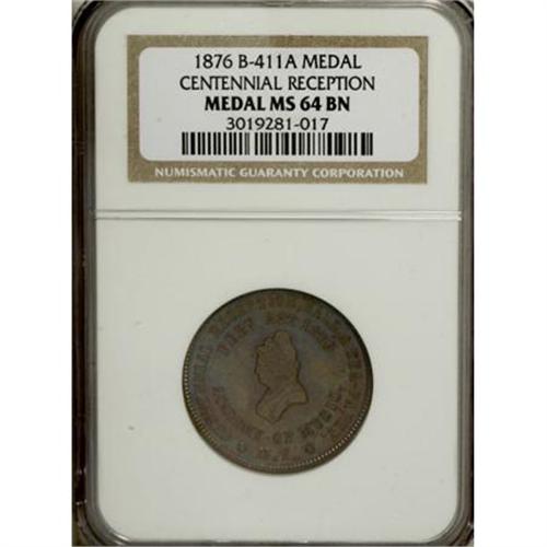 <B>1876 Washington Centennial Reception Medal MS64 Brown NGC.</B></I> B-412A, copper, 27 mm. Mistakenly identified as B-411A on the NGC holder. Struck by George Hampden Lovett and published by Isaac F. Wood, both of New York (Rulau & Fuld, <I>Medallic Portraits of Washington, </B></I>second edition, p. 187). Sharply struck with prooflike fields and multicolored iridescent toning over both sides. <I> </B></I><BR><BR><b>Shipping:</b> Coins & Currency (<a target="_blank" href="http://www.heritageauctions.com/common/shipping.php">view shipping information</a>)
