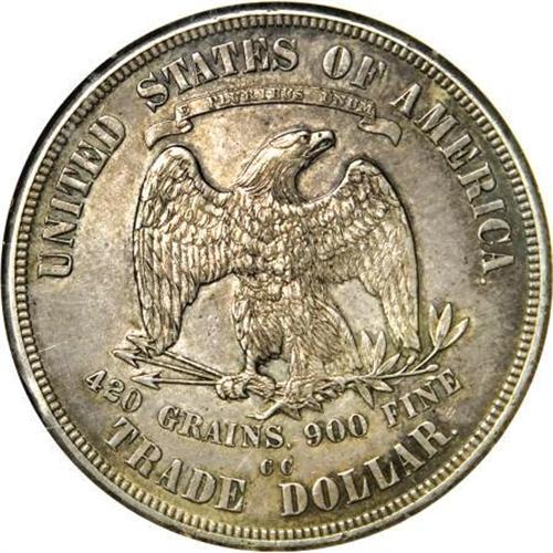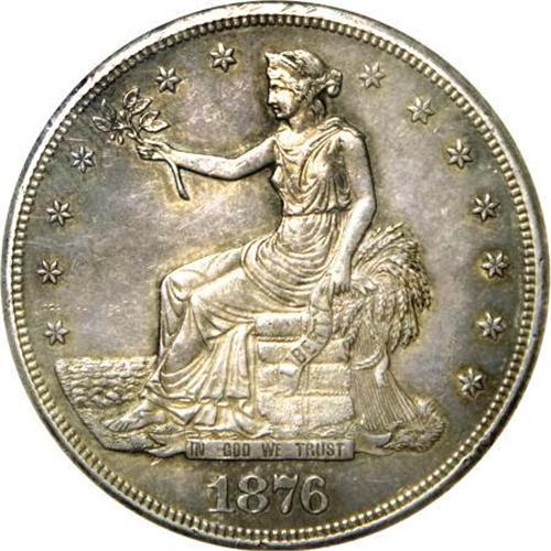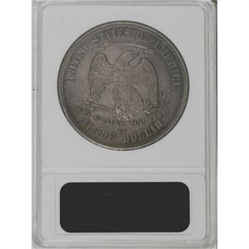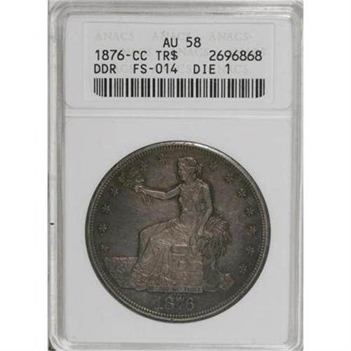 <B>1876-CC $1 Doubled Die Reverse AU58 ANACS.</B></I> FS-801, formerly FS-014. This Reverse 1 die shows prominent doubling on the central devices and substantial spread on E PLURIBUS UNUM. In the <I>Cherrypickers' Guide</B></I>, Fivaz and Stanton write that many believe this to be " ... the strongest reverse doubled die in the series ... one of the highlights of the trade dollar varieties and is thought to be extremely rare in grades above AU." This piece, well-defined with dusky, luminous blue-green surfaces that show hints of violet gold, displays just a touch of highpoint friction.<BR><BR><b>Shipping:</b> Coins & Currency (<a target="_blank" href="http://www.heritageauctions.com/common/shipping.php">view shipping information</a>)