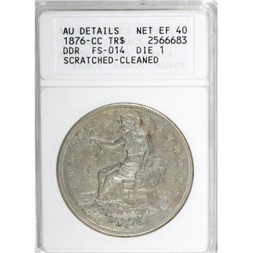 <B>1876-CC $1 Doubled Die Reverse--Cleaned, Scratched--ANACS. AU Details, Net XF40.</B></I> FS-014. Die 1. NGC Census: (0/17). PCGS Population (2/12). (#97042)<BR><BR><b>Shipping:</b> Coins & Currency (<a target="_blank" href="http://www.heritageauctions.com/common/shipping.php">view shipping information</a>)