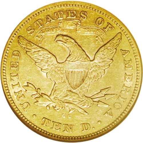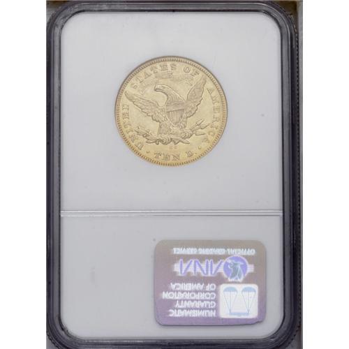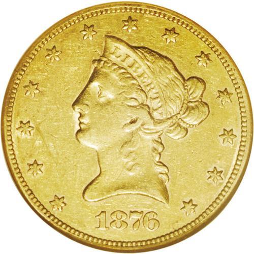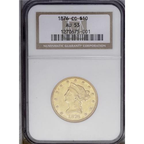<B>1876-CC<$10> AU53 NGC.</B></I> CC-mint Eagles from the 1870s are notoriously difficult to collect. Most issues are rare or very rare; the exception is the comparatively available 1874-CC. Carson City struck 138,441 double eagles in 1876, but their production of eagles was much more parsimonious. A scant 4,696 pieces were struck, and given the nature of the Nevada frontier during the era, none have certified as Mint State by either NGC or PCGS. Concerning this issue, Breen states, "Usually weak in centers." By that standard, the present piece is impressive, since the shield is sharp and Liberty's ear and nearby curls show only moderate softness. The clean peach-gold surfaces appear smooth to the naked eye, and even beneath a glass, only a single mark near star 3 bears mention. Census: 11 in 53, 6 finer (2/06).
