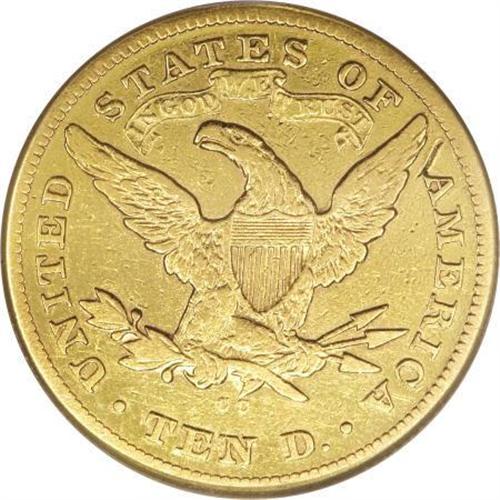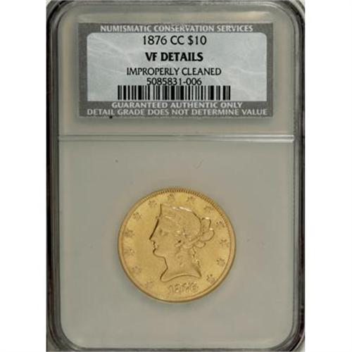 <B>1876-CC $10 --Improperly Cleaned--NCS. VF Details.</B></I> Noticeably worn with light yellow surfaces and faintly mirrored fields, this piece has been carefully cleaned with a non-abrasive polishing agent. It is still highly attractive with fewer surface marks and abrasions than usual for the grade.<BR><BR><B>Coin Engraver:</B> Christian Gobrecht<BR><BR><b>Shipping:</b> Coins & Currency (<a target="_blank" href="http://www.heritageauctions.com/common/shipping.php">view shipping information</a>)