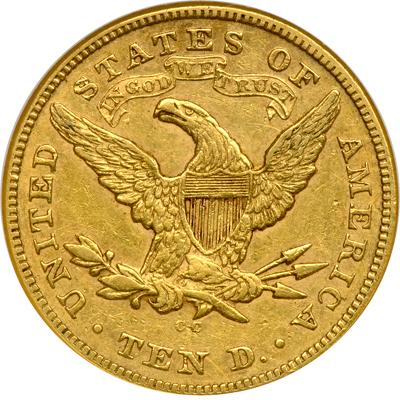 1876-CC $10 Liberty. NGC graded AU-53. A hint of light toning. Very rare date. Only 4,696 struck. This lovely coin joins others in the Carson City Mint pantheon that have a shot at Condition Census class in being every attractive. Pre-eminent figures of the past in the collecting of American gold coins and research were always attracted to CC-mint gold, as they are today. This coin stands as one of the most admired due to its association with the Centennial year of American independence, 1876.