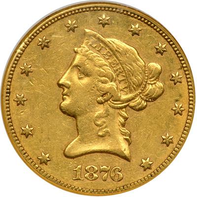 1876-CC $10 Liberty. NGC graded AU-53. A hint of light toning. Very rare date. Only 4,696 struck. This lovely coin joins others in the Carson City Mint pantheon that have a shot at Condition Census class in being every attractive. Pre-eminent figures of the past in the collecting of American gold coins and research were always attracted to CC-mint gold, as they are today. This coin stands as one of the most admired due to its association with the Centennial year of American independence, 1876.