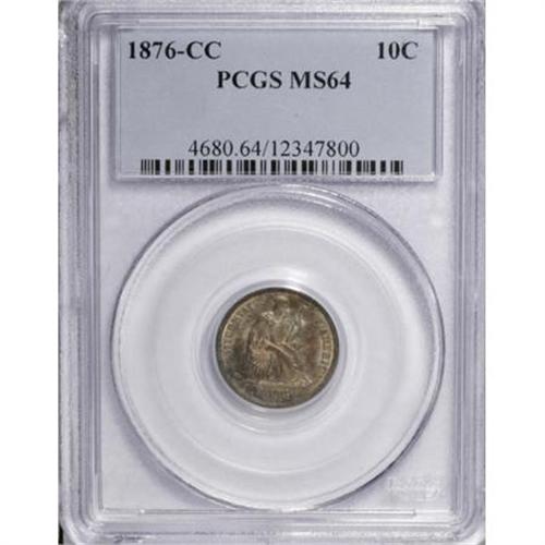 <B>1876-CC 10C MS64 PCGS.</B></I> Type One Reverse. ONE DIME is die doubled, as often seen on this Carson City issue. Richly toned in cherry-red and forest-green. Suitably struck and only lightly abraded. Population: 54 in 64, 45 finer (3/08).<BR><BR><B>Coin Engraver:</B> Christian Gobrecht<BR><BR><b>Shipping:</b> Coins & Currency (<a target="_blank" href="http://www.heritageauctions.com/common/shipping.php">view shipping information</a>)