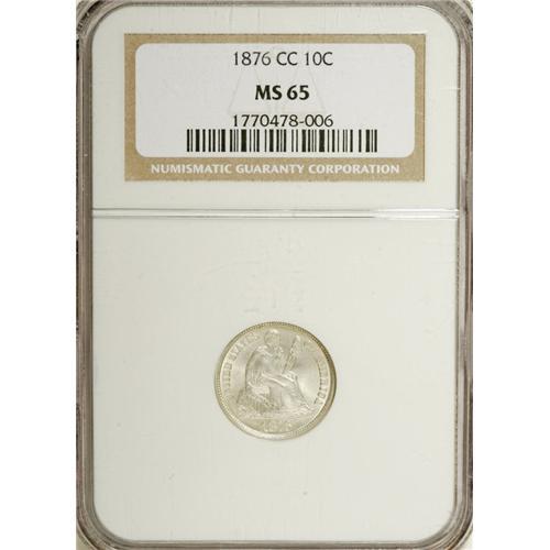 <B>1876-CC 10C MS65 NGC.</B></I> Nearly untoned, frosty surfaces exhibit sharply defined motifs. There are no mentionable marks to report. Census: 41 in 65, 24 finer (11/06).<BR><BR><b>Shipping:</b> Coin/Currency (<a target="_blank" href="http://www.heritageauctions.com/common/shipping.php">view shipping information</a>)