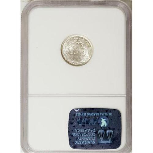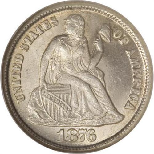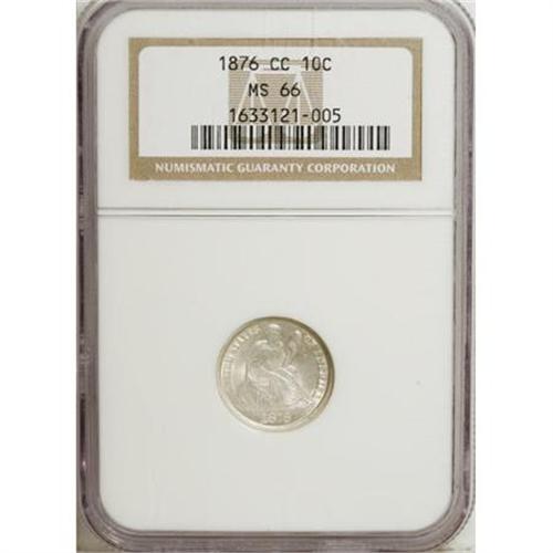 <B>1876-CC 10C MS66 NGC.</B></I> The 1876-CC dime is one of the most available minor silver issues from the Carson City Mint, with a mintage of just under 8.3 million pieces. Still, in the loftiest Mint State grades, this otherwise available issue becomes a condition rarity. This well struck and wonderfully well-preserved Premium Gem has a delightful frosty quality to the fields, which are predominantly silver-gray with a hint of golden-tan at the left obverse. NGC has graded just five coins finer (6/07).<BR><BR><B>Coin Engraver:</B> Christian Gobrecht<BR><BR><b>Shipping:</b> Coins & Currency (<a target="_blank" href="http://www.heritageauctions.com/common/shipping.php">view shipping information</a>\)