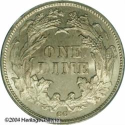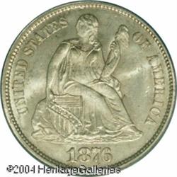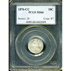 1876-CC 10C MS66 PCGS. Type One Reverse. A well st <B>1876-CC 10C MS66 PCGS.</B></I> Type One Reverse. A well struck, brilliant, and semi-prooflike Gem that has attractive preservation and blatant eye appeal. ONE DIME is nicely die doubled, as often seen on this Centennial year Carson City issue. A suitable choice to represent the No Arrows Dime within an advanced Carson City type set. Population: 8 in 66, 2 finer (11/04). <BR><BR><B>Important notice:</B> Heritage usually auctions material at the rate of 200-250 lots per hour. On some occasions eBay Live bid software or the Internet may not be able to keep up with the pace of the auction. We recommend placing a realistic absentee bid now as insurance to avoid disappointment. Occasionally the auctioneer may eliminate or reject an eBay Live bid, and the auctioneer may also reopen a lot after the close of the eBay live bidding (usually because we missed an audience bid), and may reject your bid even if it shows you as the winning bidder. By bidding via eBay Live, you agree that Heritage may award the lot to another bidder at its sole discretion under the circumstances described above or any other reasonable circumstances. Since eBay bids are not shown to us until we open the lot on the floor, we treat those bids just like floor bids. In most cases the floor responds before the eBay bid is presented to us, due to Internet lag time, so for consistency we have made it a policy that floor bids are always considered first over tie eBay live bids. Also please note that all Heritage lots purchased through eBay Live carry a 20% Buyer's Premium. Please make sure you read the Terms and Conditions before you bid. This lot is being auctioned in conjunction with a live floor auction by Heritage Galleries & Auctioneers. All final auction and invoice information will be supplied by Heritage Galleries & Auctioneers, and all other information should be considered preliminary. Lot:5720