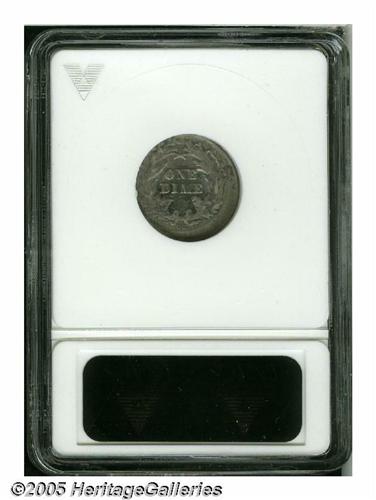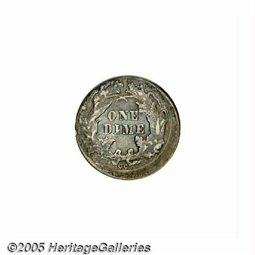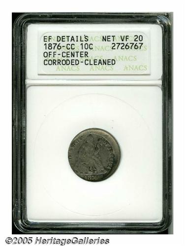 <B>1876-CC<10C> Seated Dime--Off Center, Corroded, Cleaned--ANACS. XF Details, Net VF20.</B></I> Type One Reverse. Struck between 5 and 10% off center toward 7:30. Only lightly cleaned, some flaking of the surface is noted east of the date, although die wear (as made) accounts for the blurred appearance of the devices. A conversation piece for the Carson City specialist.<BR><I>From The Larry Rausch Collection.</B></I>