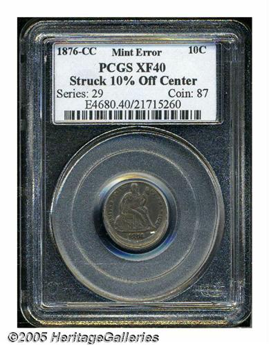 <B>1876-CC<10C> Seated Dime--Struck 10% Off Center--XF40 PCGS.</B></I> Type One Reverse. Struck off center toward 12 o'clock, the Carson City mintmark is partly off the flan but is still readily recognized. This Centennial year Dime has deep gunmetal-gray patina and no significant marks. LIBERTY is bold.<BR><I>From The Tim Cook Collection of Liberty Seated Dimes.</B></I>