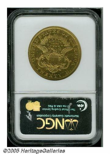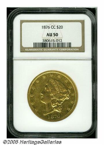 <B>1876-CC<$20> AU50 NGC.</B></I> Typically worn for the grade, with bright, semi-prooflike luster, rich green-gold toning, and numerous small abrasions, on each side, that point to this as a modestly circulated item. An important offering for the final-year branch mint type collector.