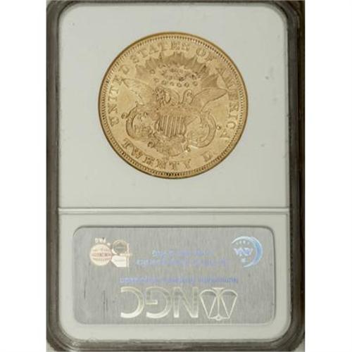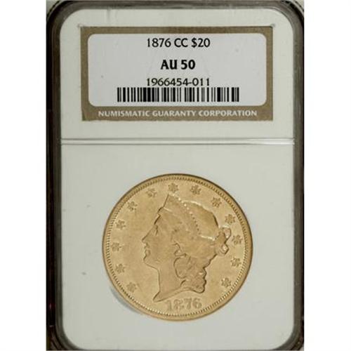 <B>1876-CC $20 AU50 NGC.</B></I> Bright yellow-gold surfaces display hints of prooflikeness in the fields. Nice definition characterizes the design elements on this lightly abraded AU50 specimen.<BR><BR><B>Coin Engraver:</B> James B. Longacre<BR><BR><b>Shipping:</b> Coins & Currency (<a target="_blank" href="http://www.heritageauctions.com/common/shipping.php">view shipping information</a>\)