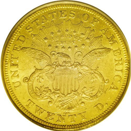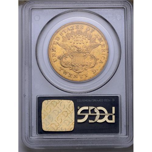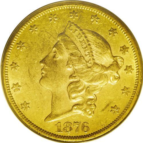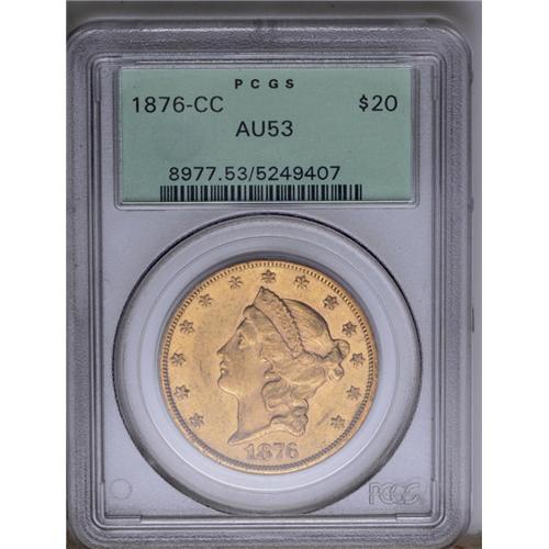 <B>1876-CC<$20> AU53 PCGS.</B></I> This was a banner year for the production of double eagles at the Carson City Mint, and the mintage of 138,441 coins set a record that would not be broken. The total was the highest mintage of any double eagle from this facility. Despite the record mintage, this is not the most common date of the series. Although a number of AU and Mint State coins have returned from overseas holdings, most are low in eye appeal with little desirability. Like so many of its peers, this example has moderately abraded surfaces, yet both sides exhibit considerable luster with brilliant green-gold color. The high points have traces of deep olive toning. In a green label PCGS holder.<BR><I>From The Wyoming Collection.</B></I>