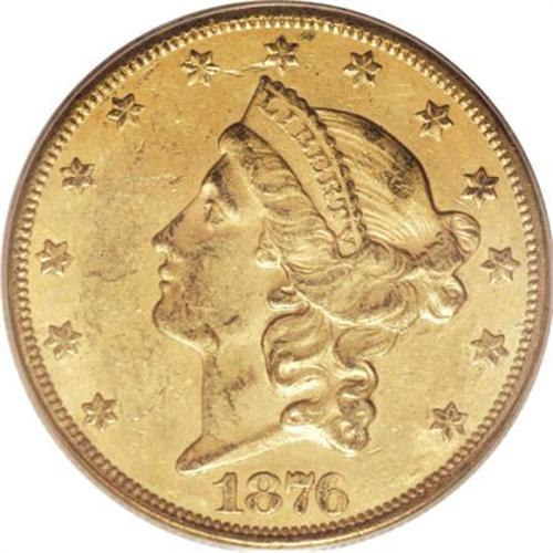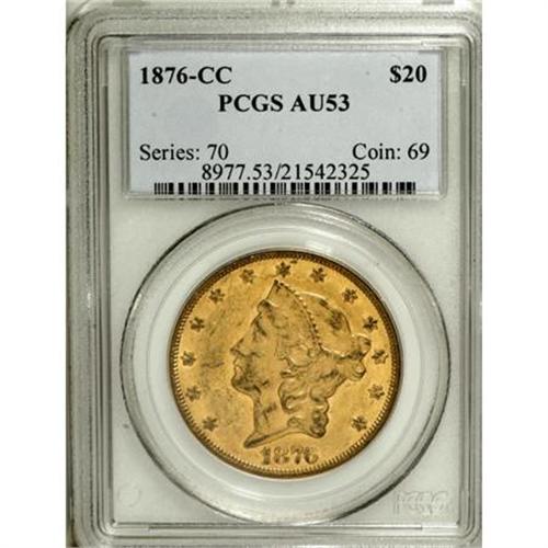 <B>1876-CC $20 AU53 PCGS.</B></I> A small patch of hairlines in the left obverse field is perhaps the grade-limiting factor of this 1876-CC double eagle, which boasts a pleasing natural patina, attesting to its originality. When viewed at an angle under a light source, delicate prooflike surfaces emerge and the visual effect is pleasing. Because most of this issue was exported overseas in bags, the typical survivor will display abraded surfaces. The current example, possessing only slightly abraded surfaces, is above average in terms of eye appeal, especially considering the assigned grade.<BR><BR><b>Shipping:</b> Coins & Currency (<a target="_blank" href="http://www.heritageauctions.com/common/shipping.php">view shipping information</a>)