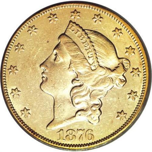 <B>1876-CC $20 AU53 PCGS.</B></I> A well struck AU53 example that displays bright brassy-gold surfaces that reveal the usual number of abrasions, none of which are worthy of individual mention. Despite light wear, the surfaces retain much of their original luster. Many of these coins had made their way to Europe and South America at the time of issue.<BR><BR><B>Coin Engraver:</B> James B. Longacre<BR><BR><b>Shipping:</b> Coins & Currency (<a target="_blank" href="http://www.heritageauctions.com/common/shipping.php">view shipping information</a>)