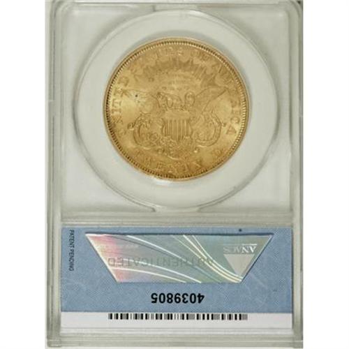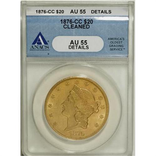 <B>1876-CC $20 --Cleaned--ANACS. AU55 Details. </B></I> The surfaces of this orange-gold double eagle are unnaturally bright, from improper cleaning. The piece is boldly struck, showing numerous small marks and hairlines, along with modest highpoint wear. A popular Carson City date, from the last year of the Type Two design. <BR><BR><B>Coin Engraver:</B> James B. Longacre<BR><BR><b>Shipping:</b> Coins & Currency (<a target="_blank" href="http://www.heritageauctions.com/common/shipping.php">view shipping information</a>)