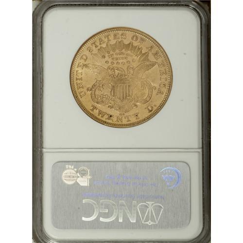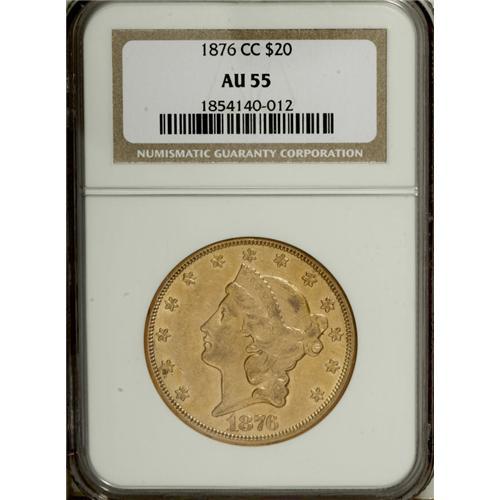 <B>1876-CC $20 AU55 NGC.</B></I> Satiny luster and medium yellow-gold color provide plenty of eye appeal to this piece. It is the final year of issue for the Type Two double eagle design, and nice examples such as this piece are usually available with a little patience.<BR><BR><b>Shipping:</b> Coins & Currency (<a target="_blank" href="http://www.heritageauctions.com/common/shipping.php">view shipping information</a>)