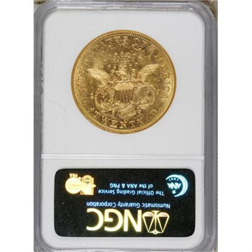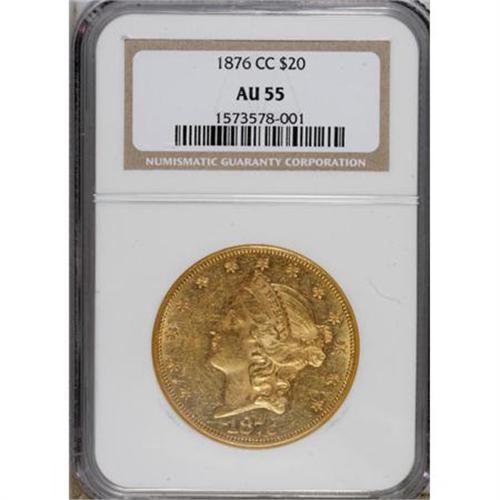 <B>1876-CC $20 AU55 NGC.</B></I> The final Type Two double eagle issue minted at Carson City also has the most generous mintage for the production run. This modestly worn example displays slightly soft detail on the devices, though the yellow-orange fields retain plenty of reflective luster. Scattered light to moderate abrasions affect the obverse, but the reverse is comparatively clean.<BR><BR><b>Shipping:</b> Coins & Currency (<a target="_blank" href="http://www.heritageauctions.com/common/shipping.php">view shipping information</a>)