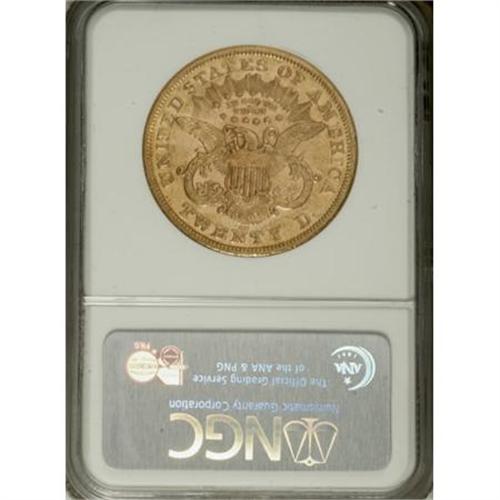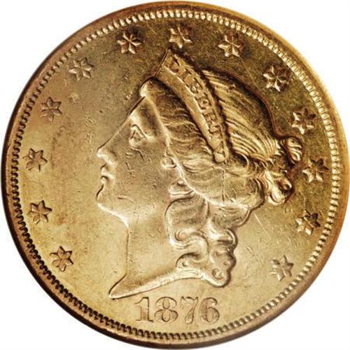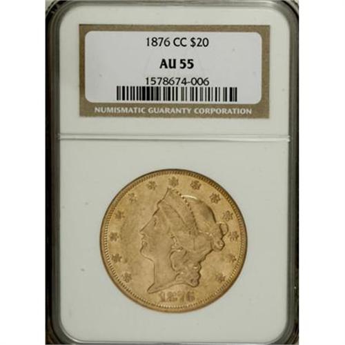 <B>1876-CC $20 AU55 NGC.</B></I> Reflective surfaces are still evident on this lightly worn piece, undoubtedly one of the first coins struck on a newly surfaced or resurfaces die pair. At the time it was struck, this piece must have been a sight to behold, for it retains considerable eye appeal despite its time in circulation.<BR><BR><B>Coin Engraver:</B> James B. Longacre<BR><BR><b>Shipping:</b> Coins & Currency (<a target="_blank" href="http://www.heritageauctions.com/common/shipping.php">view shipping information</a>)