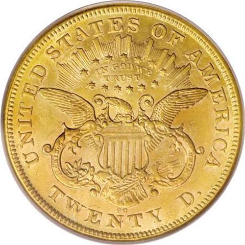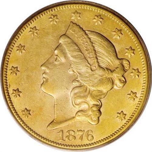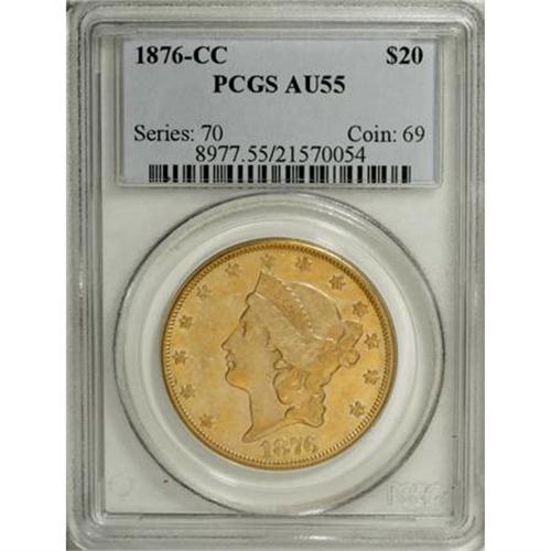<B>1876-CC $20 AU55 PCGS.</B></I> Peach-gold patination is imbued with traces of mint-green, and luster resides in the recesses of this choice AU Carson City issue. It possesses a better-than-average strike for the date, as the radial lines in most of the stars are crisp. A few minor marks scattered over both sides are consistent with what would be expected for a coin seeing limited circulation.<BR><BR><B>Coin Engraver:</B> James B. Longacre<BR><BR><b>Shipping:</b> Coins & Currency (<a target="_blank" href="http://www.heritageauctions.com/common/shipping.php">view shipping information</a>)