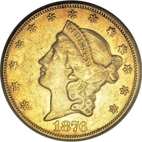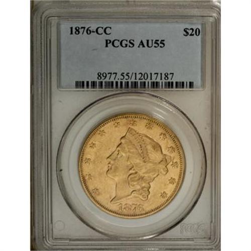 <B>1876-CC $20 AU55 PCGS.</B></I> An attractive reddish hue atop lustrous surfaces gives this 1876-CC twenty added eye appeal. Repatriation of this issue from overseas hoards has eased its overall scarcity, but pleasing, problem-free examples remain elusive. Minted during the centennial of our nation's independence.<BR><I>From The York/Hallenbeck #2 Current Finest PCGS Registry Set of Liberty Double Eagles.</B></I><BR><BR><B>Coin Engraver:</B> James B. Longacre<BR><BR><b>Shipping:</b> Coins & Currency (<a target="_blank" href="http://www.heritageauctions.com/common/shipping.php">view shipping information</a>)