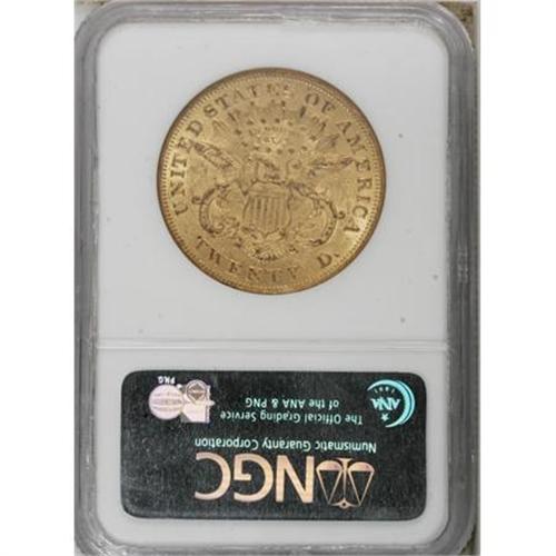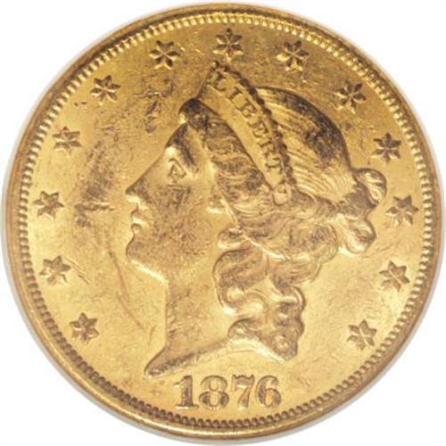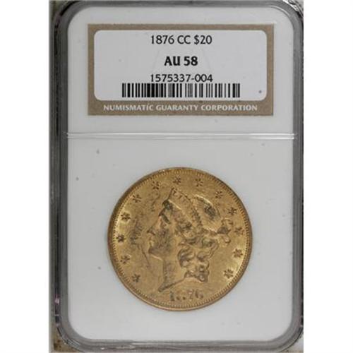 <B>1876-CC $20 AU58 NGC.</B></I> The orange-gold surfaces of this near-Mint State piece remain semiprooflike, and moderate abrasions are seen on both sides, with only a few ticks on Liberty's cheek requiring singular mention. A couple of gray-gold haze spots are seen on the highpoints. The 1876-CC double eagle offers the double allure of a Centennial-year and CC-mint issue.<BR><BR><b>Shipping:</b> Coins & Currency (<a target="_blank" href="http://www.heritageauctions.com/common/shipping.php">view shipping information</a>)