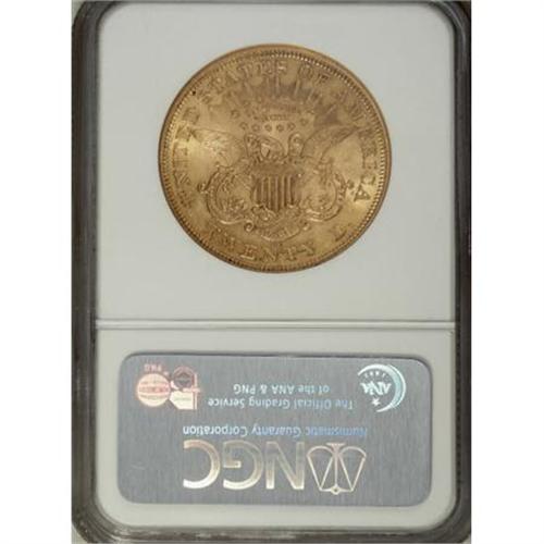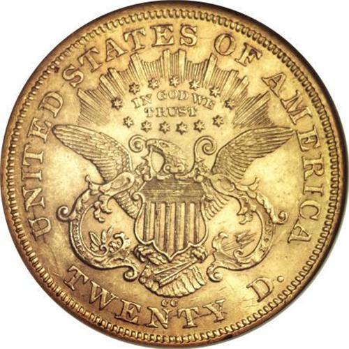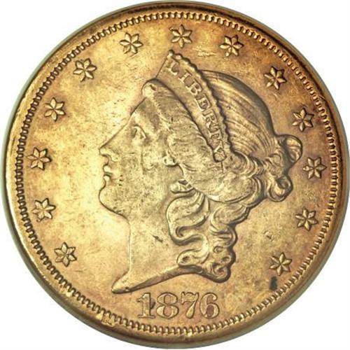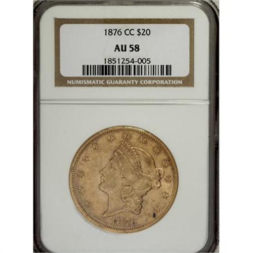 <B>1876-CC $20 AU58 NGC.</B></I> A former rarity, the 1876-CC is now known in the hundreds of Mint State pieces, most of them MS60-MS62, due to extensive repatriations from overseas. This near-Mint State example displays radiant cartwheel luster throughout, with a touch of field haze and a small struck-in die grease spot near star 13.<BR><BR><B>Coin Engraver:</B> James B. Longacre<BR><BR><b>Shipping:</b> Coins & Currency (<a target="_blank" href="http://www.heritageauctions.com/common/shipping.php">view shipping information</a>)
