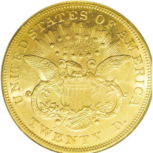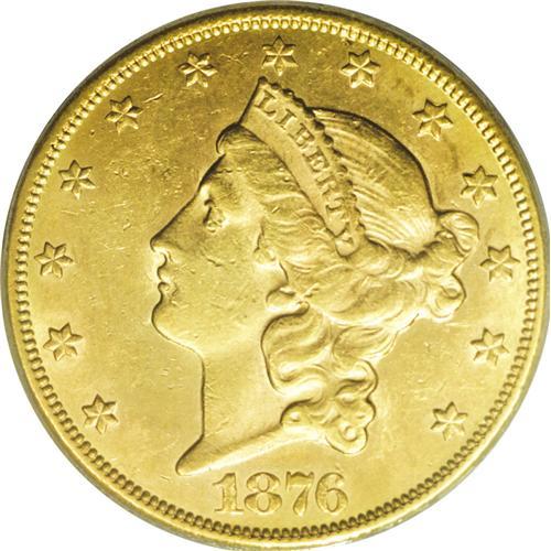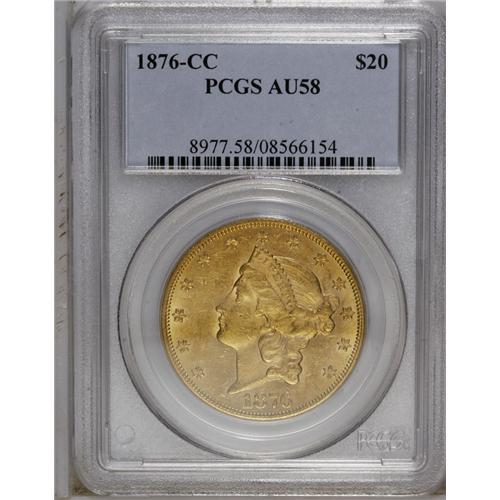 <B>1876-CC<$20> AU58 PCGS.</B></I> Lovely intermingled coloration is the hallmark of this piece, as subtle flavors of green, peach and rose adorn both sides. Traces of highpoint wear and small, scattered abrasions define the grade. The 1876-CC double eagle is relatively common and readily available at VF, XF, or AU levels, becoming considerably scarcer in Mint State.