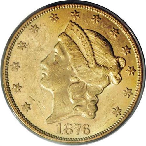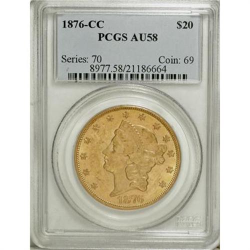 <B>1876-CC $20 AU58 PCGS.</B></I> The 1876-CC is one of the more frequently encountered Carson City double eagles, weighing in with a mintage of 138,441 pieces. Still, it is a worthwhile issue in AU58 condition, and relatively scarce in Uncirculated grades. Just a bit softly struck, the fields display the usual bright semi-prooflikeness common to this issue. Numerous small abrasions are scattered over each side, but the only one of any note is an angling scratch in the left obverse field out from star 1. <BR><BR><B>Coin Engraver:</B> James B. Longacre<BR><BR><b>Shipping:</b> Coins & Currency (<a target="_blank" href="http://www.heritageauctions.com/common/shipping.php">view shipping information</a>)