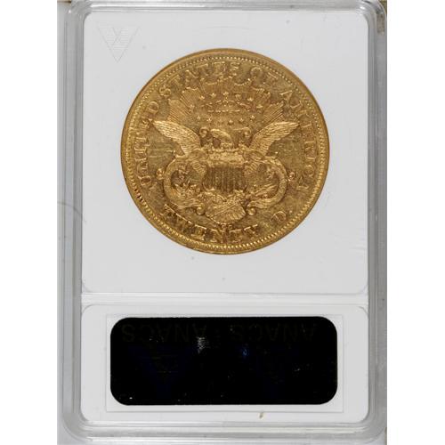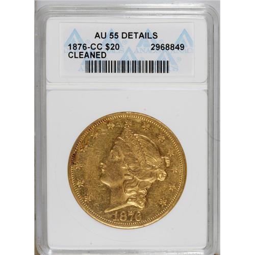 <B>1876-CC $20 --Cleaned--ANACS. AU55 Details.</B></I> Considerable bright luster accompanies the borders, but the obverse is hairlined, and there are faint scratches near stars 3 to 6 from an attempt to remove golden-brown freckles.<BR><BR><b>Shipping:</b> Coins & Currency (<a target="_blank" href="http://www.heritageauctions.com/common/shipping.php">view shipping information</a>)