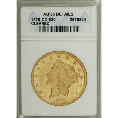 <B>1876-CC $20 --Cleaned--ANACS. AU55 Details.</B></I> Flashy luster outlines the borders and illuminates the reverse devices. Moderately abraded and a bit bright, but certainly a collectible example of this popular Carson City issue.<BR><BR><b>Shipping:</b> Coins & Currency (<a target="_blank" href="http://www.heritageauctions.com/common/shipping.php">view shipping information</a>)