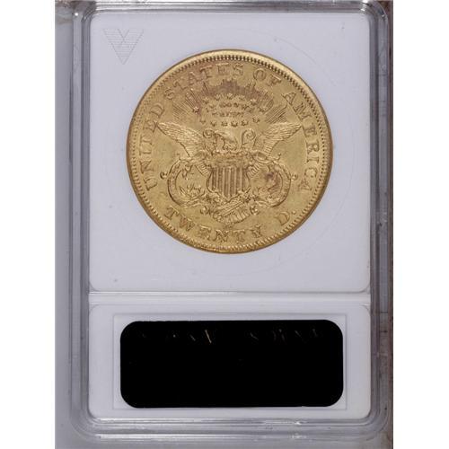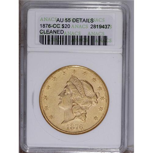 <B>1876-CC $20 --Cleaned--ANACS. AU55 Details.</B></I> Parallel hairlines indicate a past abrasive cleaning, but this sharp Type Two Carson City twenty retains considerable luminous luster.