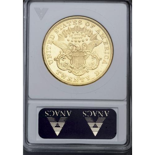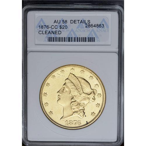 <B>1876-CC<$20>--Cleaned--ANACS. AU58 Details.</B></I> A wipe from a jeweler's cloth has given this piece a slightly bright and unnaturally prooflike appearance. A couple of specks of struck-in grease are near 5 o'clock, and the obverse is abraded near the profile and star 6. No actual wear is evident.