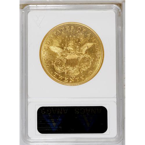 <B>1876-CC $20 --Corroded, Cleaned--ANACS. MS60 Details.</B></I> Four darkish spots occur in the lower right obverse. Whether these are corrosion, acid droppings, metal impurities, or from some other source, we cannot determine. Some fine hairlines occur over each side, but are inoffensive. Bright peach-gold patina covers both faces.<BR><BR><b>Shipping:</b> Coins & Currency (<a target="_blank" href="http://www.heritageauctions.com/common/shipping.php">view shipping information</a>)