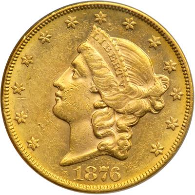 1876-CC $20 Liberty. PCGS graded MS-60. Lovely golden toning. 138,441 pieces struck of which 3,550 are estimated to have survived. Although uniformly frosted, the fields are slightly brighter than the devices on both sides, the latter being somewhat satiny. Golden iridescence is noted throughout, a consequence of the attractive toning, and the overall appearance is one of full, delightful originality.