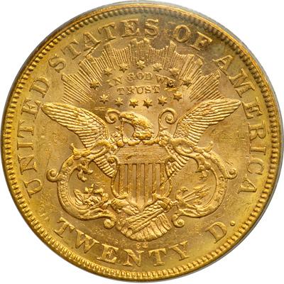 Taking a note from Rusty Goe's "The Mint on Carson Street", we learn that "From a technical standpoint, the quality of workmanship on 1876-CC double eagles receives high marks, yet because of repeated shipping and handling, eye appeal, at least from a collector's viewpoint, is often less than desirable." Which obviously puts this handsome specimen in an advantageous position vis a vis others in similar condition, since it lacks the usual heavy bag and handling marks Goe mentions. Pop 54; 120 finer, 69 in 61, 51 in 62 (PCGS # 8977) .