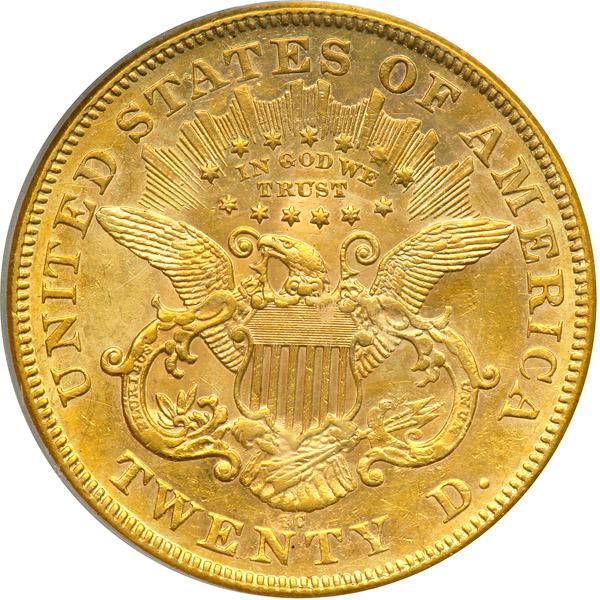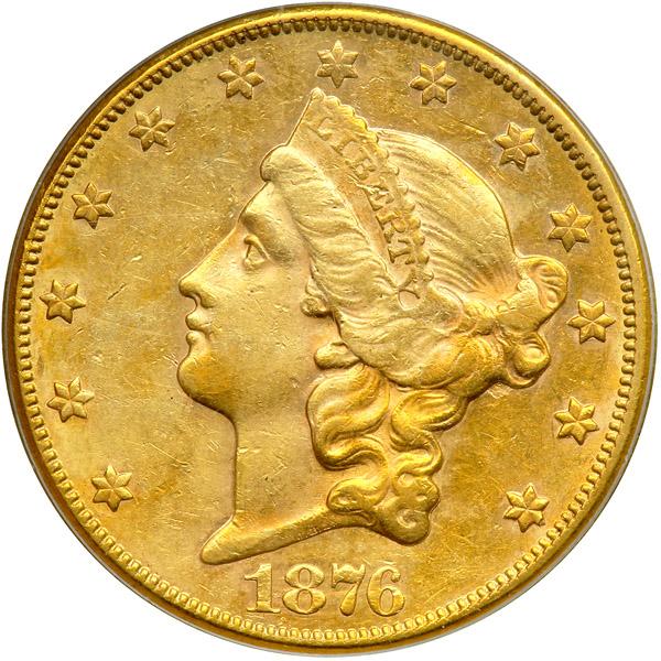1876-CC $20 Liberty. PCGS graded AU-55. Well struck with far fewer marks than usually seen for this grade. Attractive olive color gold toning. A total of 138,441 struck for this popular "CC" mint double eagle. Final year of the Type 2 $20 gold design. Pop 200 (PCGS # 8977) .