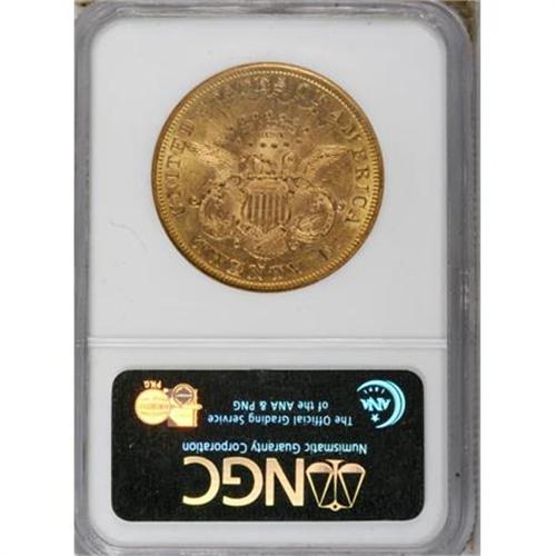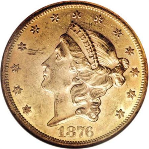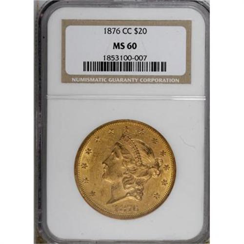 <B>1876-CC $20 MS60 NGC.</B></I> The 1876-CC is available in XF and AU grades, but Mint State examples are scarce, and the issue becomes prohibitively rare above the MS62 level. This piece has luminous luster and a surprisingly mark-free reverse. The obverse is only moderately abraded aside from the field near star 4 and a pinscratch to the R in LIBERTY.<BR><BR><B>Coin Engraver:</B> James B. Longacre<BR><BR><b>Shipping:</b> Coins & Currency (<a target="_blank" href="http://www.heritageauctions.com/common/shipping.php">view shipping information</a>)