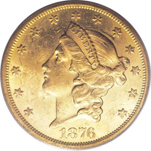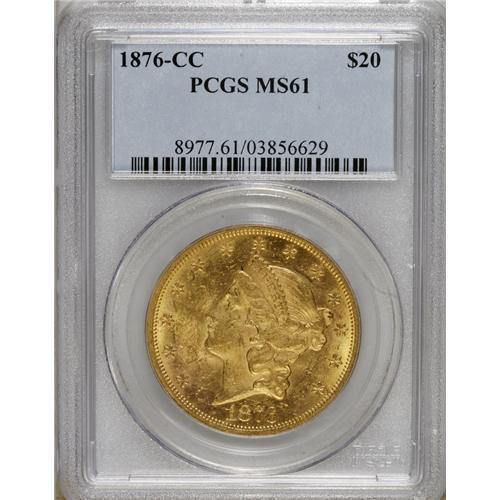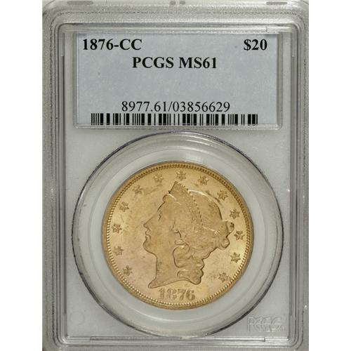 <B>1876-CC $20 MS61 PCGS.</B></I> A portion of the mintage of 138,441 1876-CC double eagles were shipped abroad to facilitate international financial transactions. Fortunately for present day collectors, a small supply of Mint State examples have resurfaced in Europe and South America in recent decades. It is unfortunate, however, that the survivors were haphazardly transported in bags and, as a result, almost always display abraded surfaces. This reality is supported by the fact that PCGS has not graded a single 1876-CC twenty higher than MS62. This is a lovely coin that shows uncommonly pronounced mint luster. Sharply struck throughout with the usually expected small abrasions from a coin in this grade. Population: 51 in 61, 51 finer (4/07).<BR><BR><b>Shipping:</b> Coins & Currency (<a target="_blank" href="http://www.heritageauctions.com/common/shipping.php">view shipping information</a>)