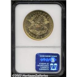 1876-CC $20 MS62 NGC. A well struck piece with impressive bright luster and no objectionable abrasions. A minor scrape near the eagle's right (facing) shoulder is not conspicuous. The final Type Two Carson City Double Eagle. Although it is well known that the denomination changed from TWENTY D to TWENTY DOLLARS the subsequent year, a lesser known characteristic is that the letters in IN GOD WE TRUST were re-engraved. The O in GOD is well centered on the Type Two but not the Type Three, while the S in TRUST noticeably leans left on the Type Two design. The 1876-CC is not a difficult issue to find in AU grades, but Uncirculated examples are very scarce, and Select survivors are very rare. As of (11/03), only five pieces have been certified finer at NGC, and none have been encapsulated in higher grades by PCGS. Important notice: Heritage usually auctions material at the rate of 200-250 lots per hour. On some occasions eBay Live bid software or the Internet may not be able to keep up with the pace of the auction. We recommend placing a realistic absentee bid now as insurance to avoid disappointment. Occasionally the auctioneer may eliminate or reject an eBay Live bid, and the auctioneer may also reopen a lot after the close of the eBay live bidding (usually because we missed an audience bid), and may reject your bid even if it shows you as the winning bidder. By bidding via eBay Live, you agree that Heritage may award the lot to another bidder at its sole discretion under the circumstances described above or any other reasonable circumstances. Also please note that all Heritage lots purchased through eBay Live carry a 20% Buyer's Premium. Please make sure you read the Terms and Conditions before you bid.