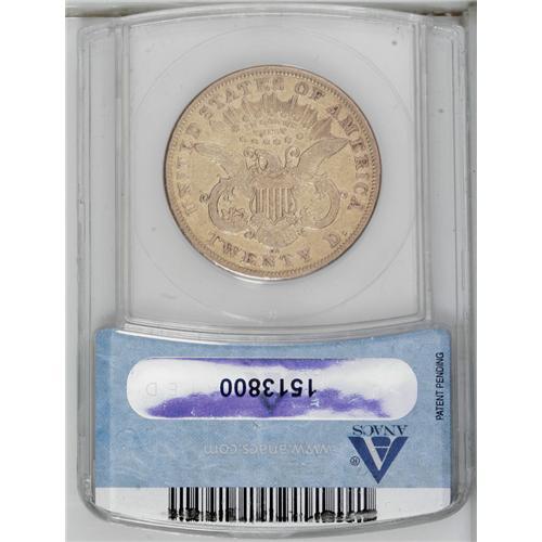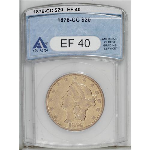<B>1876-CC<$20> XF40 ANACS.</B></I> A significantly marked orange-gold piece from the Carson City Mint that evokes the American centennial as well. The soft strike combines with light to moderate wear on the devices, though traces of original luster confirm the grade.